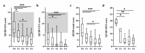 At baseline, QUID showed that 22/24 patients had SUI, 7 had UUI, and 6 had both (Table S4). Median QUID-SUI and QUID-UUI scores were 7.5 (min 2, max 15) and 3 (min 0, max 9), respectively (Tables S1 and S2). After laser treatment (T1), SUI scores improved significantly (p<0.05) (Figure 3a), but not UUI, total QUID, or MUI scores (Figure 3 b, c and -d, Table S2). After HITS treatment (T2), all QUID domains improved significantly (p<0.05), with effects persisting up to 6 months (SUI: 3 [min 0, max 8] and UUI at 1 [min 0, max 3]).