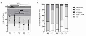 At baseline (T0; n=24), ICIQ-UI scores indicated the one patient had mild SUI (4.2%), 8 (33.3%) moderate, and 15 (62.5%) severe, with an average score of 12.46 ± 3.40 (Tables S1 and S2, Figure 2). Symptoms improved significantly after combined therapy (p<0.001) and persisted for 6 months (p<0.001), with a mean score of 5.48 ± 4.06 (Figure 2a, Table S2). At 6 months, 3 patients out of 23 who filled out the questionnaire (13.0%) were dry, 10 (43.5%) had mild, 8 (34.8%) moderate, and 2 (8.7%) severe symptoms (Figure 2b). Severe SUI symptoms decreased after laser therapy (T1), shifting towards mild and moderate symptoms (Figure 2b). While no significant improvement occurred at the final HITS therapy session (T2) compared to T1, symptoms improved significantly at the 3- and 6-month follow-ups (Figure 2a, Table S2). The reduction in ICIQ-UI scores exceeded the -2.52 MID threshold at all time points (Table S3).