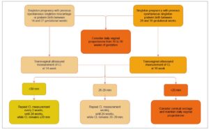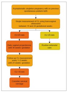This universal screening strategy facilitates timely and targeted preventive interventions, including vaginal progesterone therapy (moderate- to high-quality evidence; grade A recommendation for women with a history of PTB and grade C for those without a prior PTB; Figure 1) [14] and cervical cerclage in selected high-risk women (moderate- to high-quality evidence; grade C recommendation) [15]. At the same time, it helps minimize unnecessary interventions in low-risk pregnancies (Figure 2).
