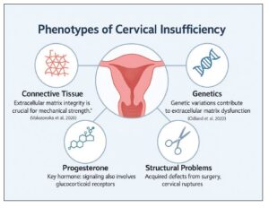 In many women, this phenotype results from degradation of the extracellular matrix (ECM), potentially driven by subclinical infection, sterile inflammation, or dysregulated progesterone signaling, all of which weaken cervical collagen structure and biomechanical integrity. In others, the underlying cause is anatomical trauma, such as prior cervical conization, repeated dilation and curettage, or excessive mechanical stress during previous deliveries. These mechanisms are not mutually exclusive and may coexist, particularly in women with recurrent or early-onset cervical shortening.