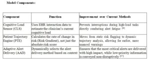 - Cognitive Load Sensor (CLS): A classification model (i.e. Random Forest) that processes real-time clinician activity logs to categorize the user’s state as Low Load, Medium Load, or High Load. This serves as the primary mechanism for mitigating alert fatigue by preventing interruptions during critical tasks [25].