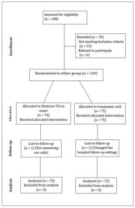 A total of 149 participants were randomly assigned in a near 1:1 ratio to one of two treatment groups: TXA or dextrose 5% in water. The allocation sequence was generated using block randomization with a block size of 4 via Random Allocation Software (version 2.0) [26]. This method ensured continuous balance (maintaining a 2:2 ratio after every four assignments) throughout the enrollment period, resulting in a final allocation of 75 participants in one group and 74 in the other.