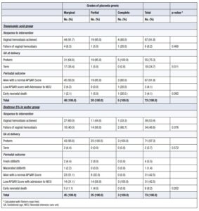 In the TXA group, no significant association was found between the grades of placenta previa and vaginal bleeding outcomes. All types of placenta previa appeared to respond similarly to TXA in terms of reduced minor vaginal bleeding, prolonged pregnancy, and perinatal outcomes.