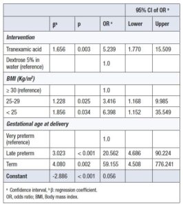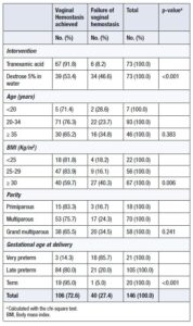 Factors significantly associated with vaginal hemostasis were the use of TXA (OR = 5.2; 95% CI: 1.7–15.5), BMI <25 kg/m² (OR = 6.3; 95% CI: 1.2–35.5), and BMI 25–29 kg/m² compared with BMI ≥30 kg/m², late preterm delivery (OR = 20.6; 95% CI: 4.6–90.2), and term delivery (OR = 4.5; 95% CI: 4.5–776.2) compared with very preterm deliveries (Table 5).