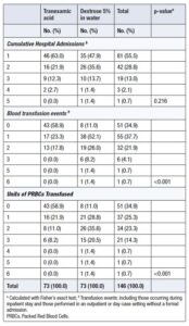 There were no significant differences between the two groups in overall inpatient hospital admissions. However, the placebo group had a significantly higher number of blood transfusion events (including both inpatient and outpatient/day-case events) compared with the TXA group, as shown in Table 1.